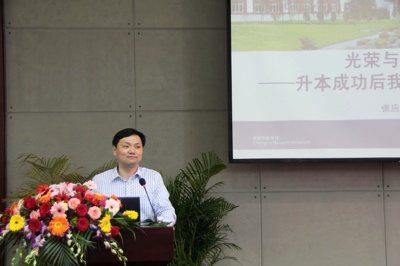 随后,院长张应辉博士做了讲话。他首先对为学院升格本科工作做出贡献的全体教职员工表示了感谢,正是因为全体员工同心同德、齐心协力,学院才得以取得跨越式的发展。。接着,他做了题为《光荣与梦想——升本成功后我们的思考与行动》的主题报告。