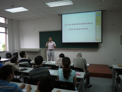本次交流由信息系统教研室主任余阳老师和徐金亚老师分别从工程教育改革的现代动力、CDIO潜在目标和愿望、CDIO专业计划的主要特征、实施CDIO改革方法、CDIO工程教育模式概述、CDIO教学大纲的内容和结构等方面,结合信管系专业教学与学生管理具体工作,与大家交流了自己学习CDIO的深刻体会和个人见解。